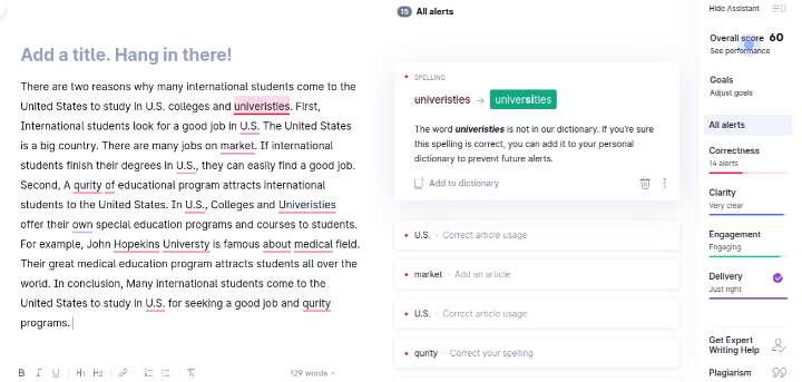 무료 영어 첨삭 사이트가 100% 다 만족스럽게 고쳐주지 않지만, 무료 서비스를 사용할 경우 60-80%, 특히나 가장 심하게 자주 틀리는 부분은 잡아주기 때문에 영어 초보에게는 아주 좋다.