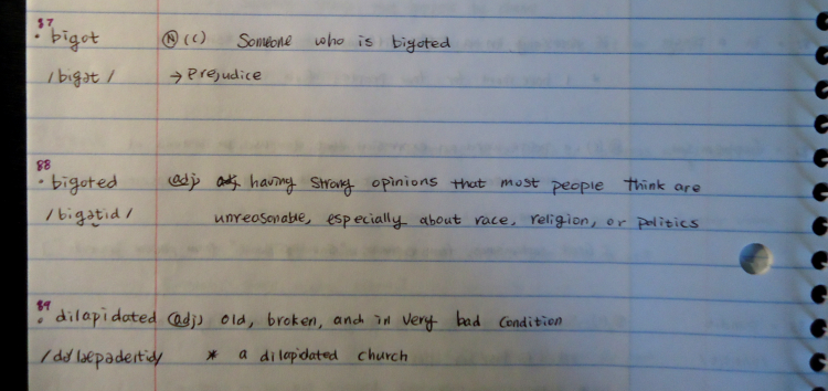이건 미국에 와서 다시 만들었던 단어장이었는데, 이때부터는 영영 사전을 통해서 의미를 파악할 려고 노력했고, 발음 기호도 찾아서 써보고 나름 사전에 있던 예문도 썼는데, 문제점은 들어가는 글씨가 많다 보니, 작은 수첩으로는 공간이 부족해서 노트에 썼는데, 보는 빈도가 너무 낮아 버렸다. 그래서 모르는 단어를 찾아서 단어장에 적을 때 빼고는 보질 않게 되었다.