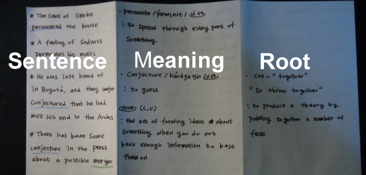 A4를 세 등분해서 접은 걸로 가장 왼쪽에는 예문을 그리고 중간에 발음 기호, 품사, 의미 마지막은 어원과 그 단어의 부사형 또는 형용사형을 적어주기도 한다.