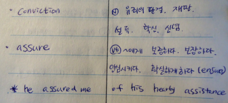 단어를 알 것 같고, 외웠다고 방치 하는 것이 아니라 그 단어를 며칠 있다가 다시 보고, 또 며칠 보고 다시 보는 반복을 계속한다. 볼 때마다 새로운 느낌이 드는데, 잘 보이지 않았던 문법 요소 라던가, 그 단어와 쓰이는 동사, 전치사, 명사 형태까지 다시 보이게 된다. 그리고 자연스럽게 같이 외우게 된다.