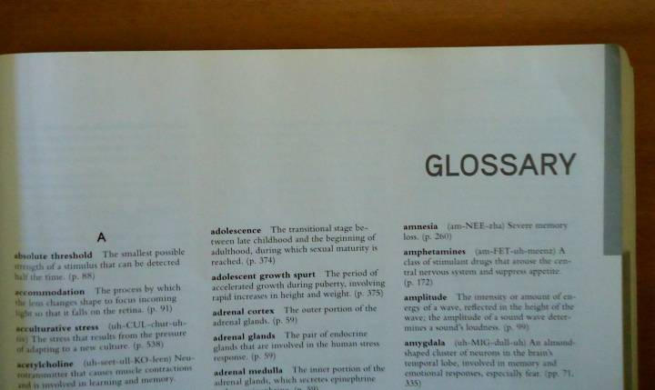 모든 전공 원서 책에 glossary 용어 사전 부분이 책 뒤에 알파벳 순서로 있다. 전공 용어 단어들은 보통 영어 사전을 찾으면 나오지 않는, 또는 전공 용어와 살짝 다르게 설명이 되어 있기 때문에 정확한 뜻을 찾기가 힘들다. 그래서 glossary가 굉장히 유용하고 중요하다. 1학년 기초 책에선 웬만한 전공 용어들이 다 기재되어 있으므로, 외우고 확실하게 이해하는 게 좋다. 앞으로 계속 나오기 때문이다.